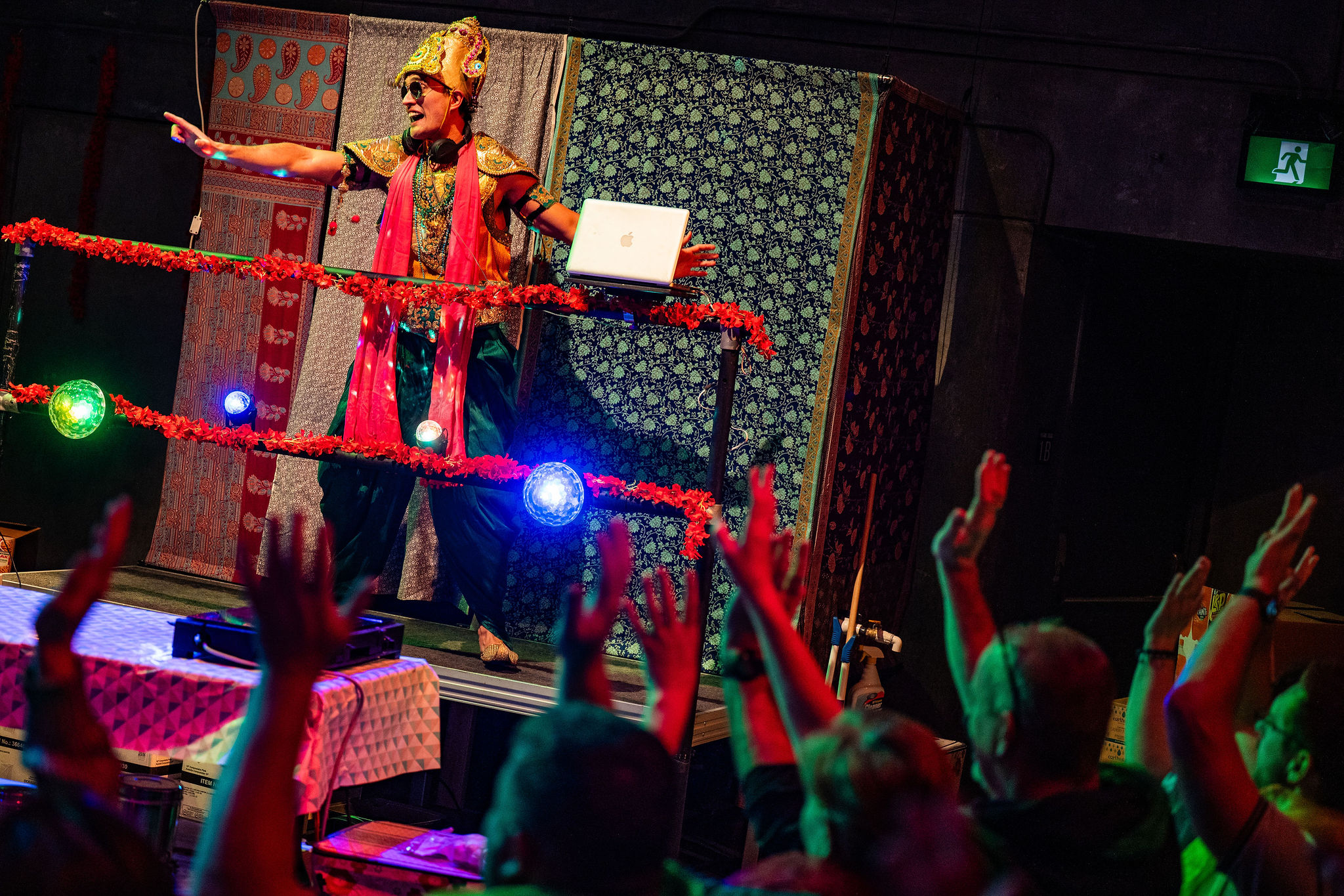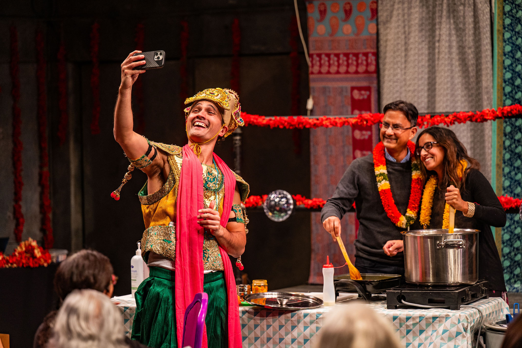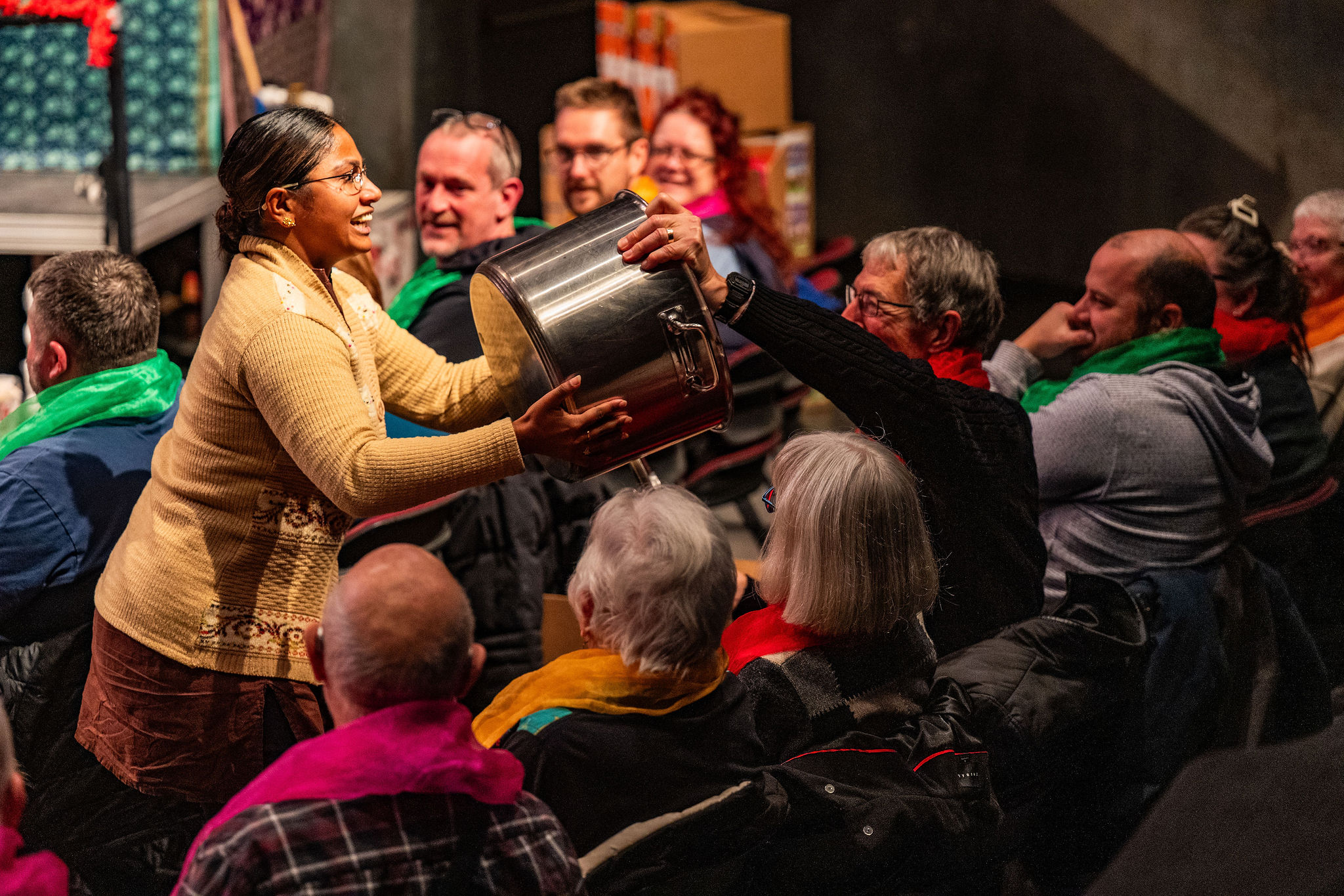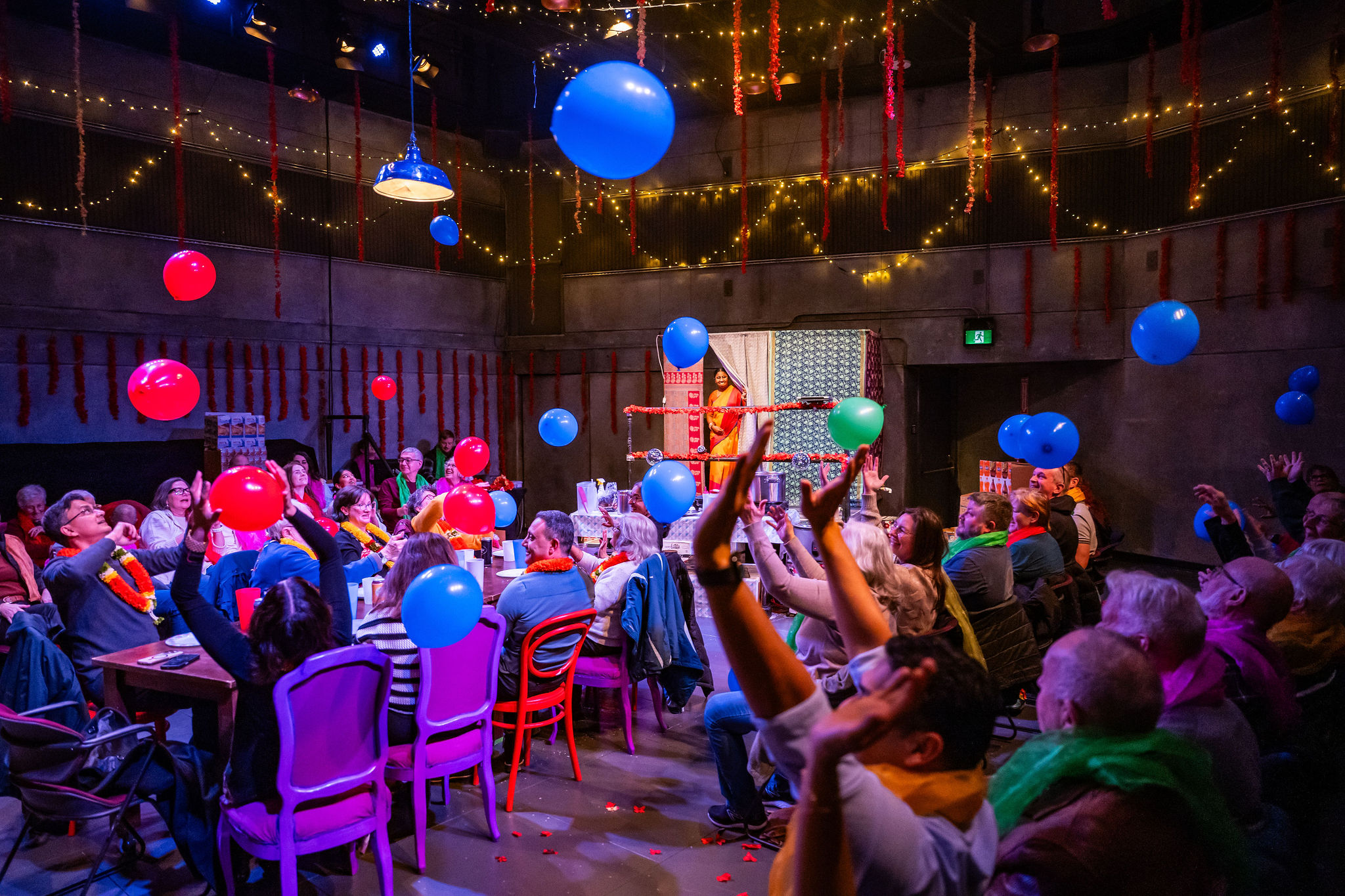 Audience Advisory: Latex balloons in close proximity to audience members. Food is cooked and served, containing ingredients including lentils, tomato, garlic, spices. View full recipe.