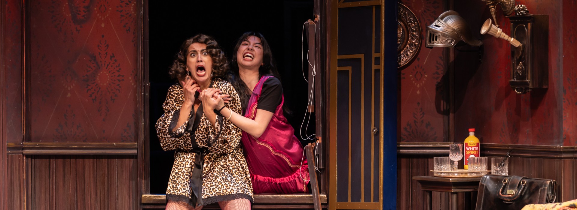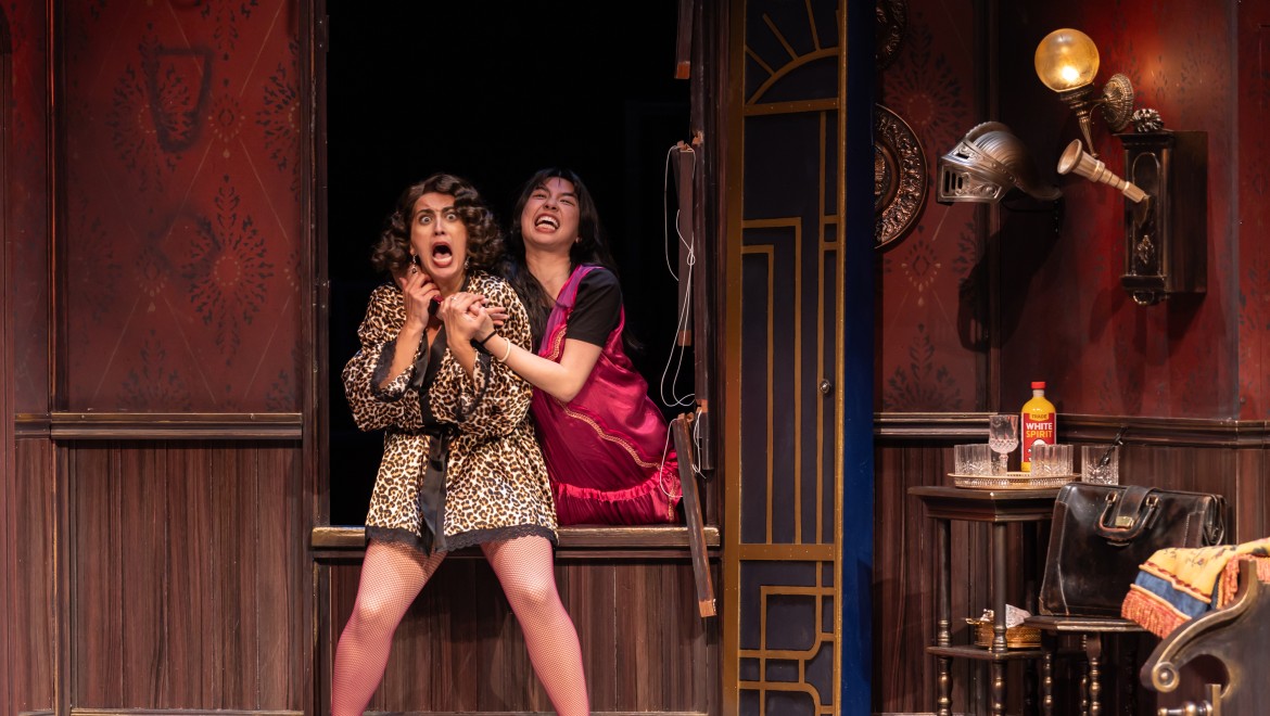Pictured: Vanessa Leticia Jetté as Sandra and Honey Pham as Annie in THE PLAY THAT GOES WRONG (2024, The Citadel Theatre in partnership with Theatre Calgary and Royal Manitoba Theatre Centre). Director -Dennis Garnhum. Fight/Movement Director - Morgan Yamada. Set Designer - Beyata Hackborn. Costume Designer - Joseph Abetria. Lighting Designer - Kimberly Purtell. Sound Designer - Dave Pierce. Photography - Nanc Price.